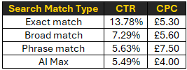 Across the ROAST MCC, AI Max testing shows cheaper CPCs with CTRs comparable to phrase, further highlighting that phrase is no longer viable at scale. Exact match retains strategic value, especially for high-intent objectives where CTR matters most. This trend is consistent across verticals including property, insurance, and healthcare logistics.
